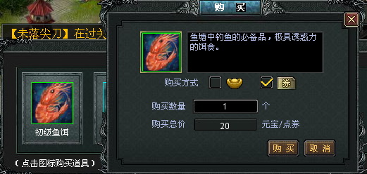2、点击获得鱼饵,即可购买鱼饵,现在鱼饵分2种,初级鱼饵和高级鱼饵,分别是20元宝/点卷和50元宝;