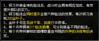 秘法分为包含战魂秘法(提升攻击属性)、金刚秘法(提升防御属性)、傲血秘法(提升体力属性)、飞星秘法(提升敏捷属性)、鸿运秘法(提升幸运属性)、修罗秘法(提升诅咒属性)六种,研习神机秘法需要消耗一定数量的金叶子。金叶子可以在百战千军活动中获得,也可以通过拍卖行从其他君主处获得。