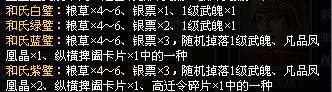 1.和氏玉璧:粮草和银票必得,其他随机有1级武魄1个,纵横捭阖卡1张,凡品凤凰晶2个,高迁碎片1个。----------出处联盟福利,这个大家都是知道的。(合璧只能与本联盟成员或者分身)