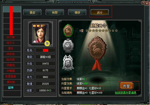 首先,《七雄争霸》的玩家们应该知道游戏中的武令系统是指每个武将都可以拥有3个武令,分别是指麒麟武令、雪凤武令、神龙武令,当一个武令满星时,就可以激活下一级的武令,武令可以为武将提升一定数量的武将统率属性,《七雄争霸》玩家们可以通过在点将台来查看自己的武令。现在小编来给各位玩家们讲讲《七雄争霸》中的武令要如何升星。