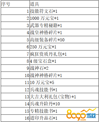 l 合服礼包:打开获得 经验丹碎片*500,100000元宝*50,坐骑升阶丹*300,浩然气*30,佛性升阶丹*30