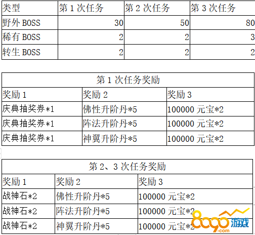 BOSS悬赏:活动期间,击杀指定类型的BOSS(野外BOSS、稀有BOSS、转生BOSS)达到数量要求即可获得奖励,奖励也会包括“庆典抽奖券”