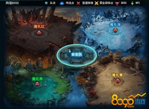 活动开启时,玩家初始于中央的安全区出生。分别有魔礼青、魔礼红、魔礼海、魔礼寿四个BOSS分布在地图四角,玩家可随意选择BOSS前往击杀。BOOS难度为:魔礼青 < 魔礼红 < 魔礼海 < 魔礼寿。