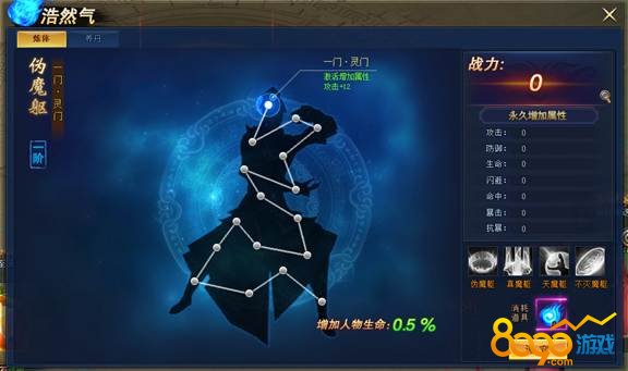 玩家达到100级即可开启浩然气炼体。消耗材料浩然气通窍,每通窍一门都会永久增加一定属性。炼体等阶从低到高为伪魔躯、真魔躯、天魔躯、不灭魔躯,每种5阶,每阶17窍。
