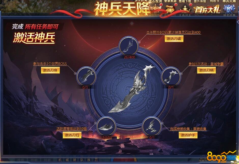 玩家想要后的神兵天降 ,首先要获得高额战力神兵,就要先完成所有的任务,激活刀身、刀魂、刀柄、护手、刀刃才能获得永久的属性。