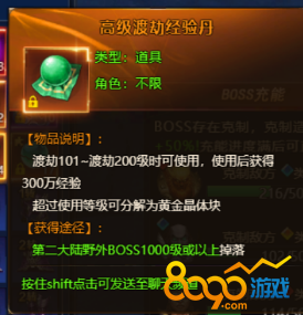 高级别的经验丹虽然没有普通经验丹爆得多,但是越到后面爆率会不断增加的,早期的时候有经验丹碎片就不要合成,留着到后面合成高级经验丹,这是最划算的。等级在达到了渡劫之后经验丹爆率变少了,升级需要的经验更多,我们这时候除了多打boss爆经验丹之外,可以把之前攒的经验丹碎片合成来使用了。