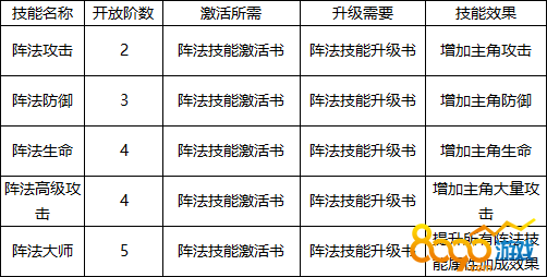 当玩家阵法升到一定的阶数时,可以消耗“阵法技能激活书”来激活阵法技能
