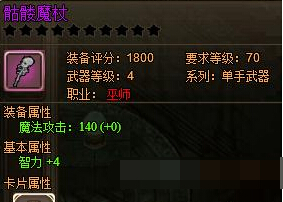骷髅魔杖可以说是专门为巫师量身定做的武器了。一个四阶武器可以有四个普通卡片的卡槽带一个BOSS级别卡片的卡槽。本身加140点的魔法攻击再加上4点的智力也是给这个武器景上添花。