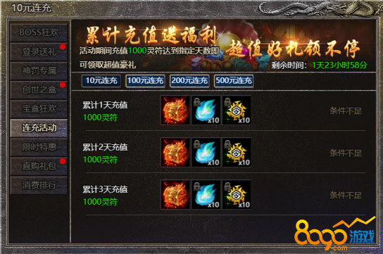 1.活动期间,充值一定的灵符达到指定天数即可领取超值豪礼;