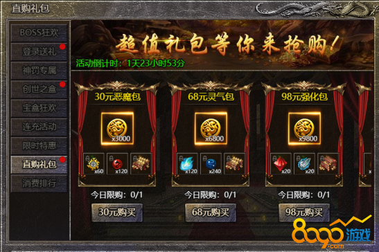 1.活动期间,玩家可在活动面板购买限购礼包,神剑特惠、神甲特惠、魔魂特惠、徽记特惠、经脉特惠、神阶特惠