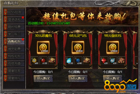 1.活动期间,玩家可在活动面板购买限购礼包,神剑特惠、神甲特惠、魔魂特惠、徽记特惠、经脉特惠、神阶特惠、荒古特惠