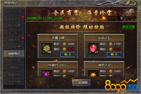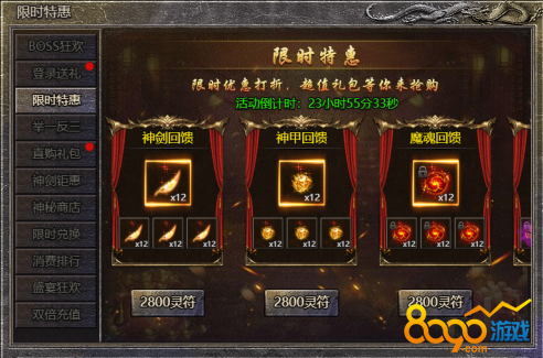 1.活动期间,玩家可在活动面板购买限购礼包,神剑特惠、神甲特惠、魔魂特惠、徽记特惠、经脉特惠、神阶特惠、荒古特惠、蛮王特惠