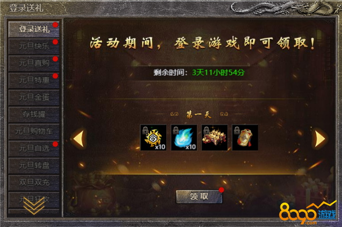 1.活动期间,玩家每天登录游戏,可以在活动界面中领取一份奖励;