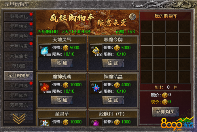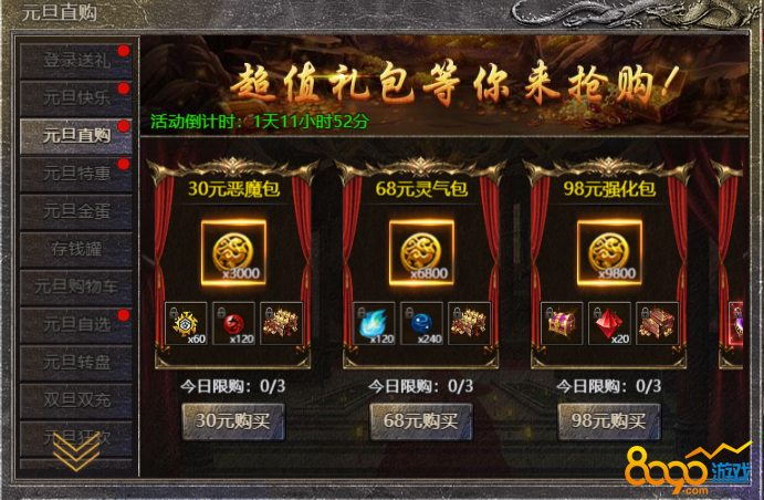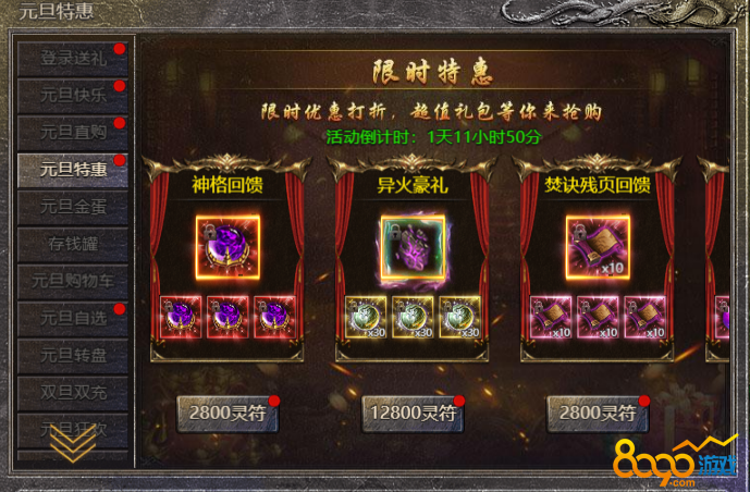 1.活动期间,玩家可在活动面板购买限购礼包,神剑特惠、神甲特惠、魔魂特惠、徽记特惠、经脉特惠、神阶特惠、荒古特惠、蛮王特惠、铭文特惠、坐骑回馈、飞升丹回馈、天命丹回馈、焚诀残页特惠、异火特惠、神格特惠
