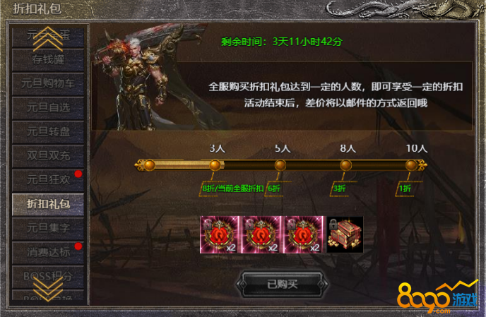 1.全服购买折扣礼包达到一定的人数,即可享受一定的折扣;