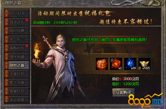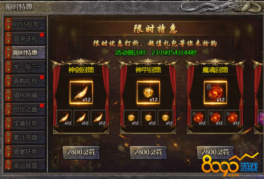 1.活动期间,玩家可在活动面板购买限购礼包,神剑特惠、神甲特惠、魔魂特惠、徽记特惠、经脉特惠、神阶特惠、荒古特惠、蛮王特惠、铭文特惠