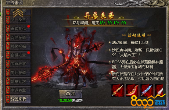 1.活动期间,每晚18:30将在沙巴克中间刷出一只超级BOSS;