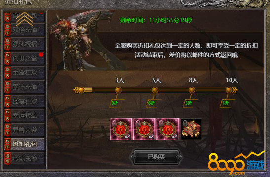 1.全服购买折扣礼包达到一定的人数,即可享受一定的折扣;