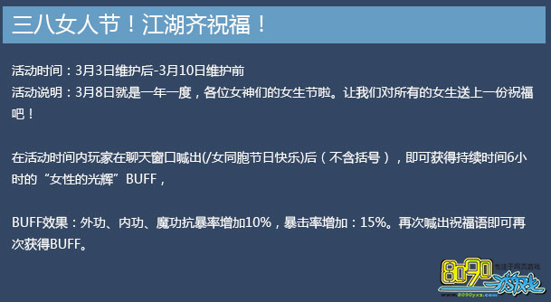 只要在活动期间内在聊天频道打出/女同胞节日快乐,就能刷出一个6小时BUFF,提供玩家内功外功魔攻抗爆率和暴击率。