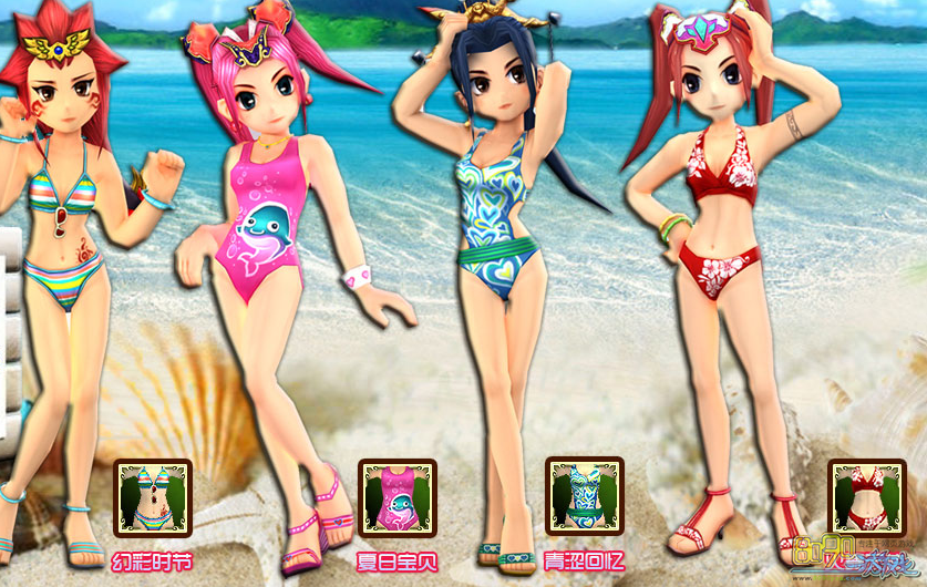 这次出售的泳装都是之前几年每年推出来的综合,所以有的样式还是比较久远的,而且名字都没变幻彩时节,夏日宝贝,青涩回忆和火舞天使。现在的眼光看的话火舞天使还算一个不错的时装。