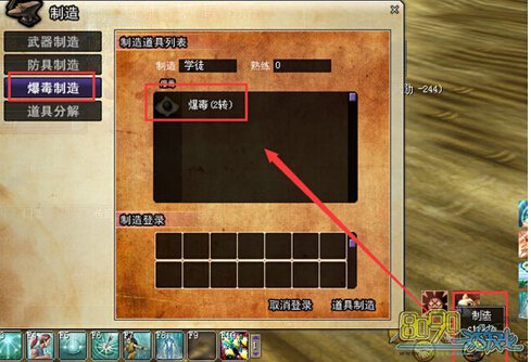 任何职业,任何游戏玩家角色,都可以到新手泫渤派大宝进银币广场,找NPC银香玉学习火工职业,学习火工职业制作后,在新手点击制作选项或者键盘命令CTRL+M,即可呼出制作栏,在火工栏里,可以看到2转爆毒提示。