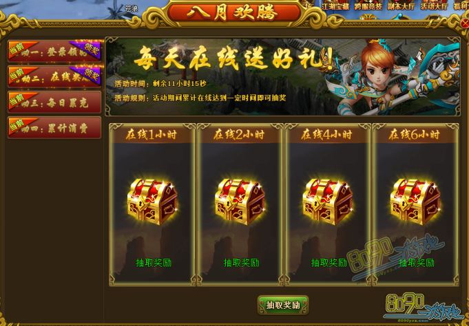 活动规则:活动期间,在线时长满足要求即可随机抽奖获得稀有道具。