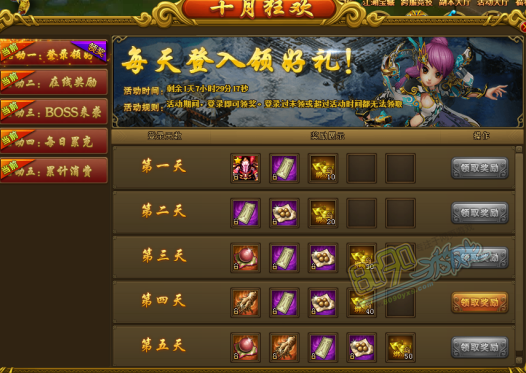 4. 每日累计充值2000元宝可获得:(姻缘石*10、中级暗器碎片*20、突破丹*8、铸造石宝箱*20)4选一、绑元*500、副本卷轴*10、披风兑换券*40;