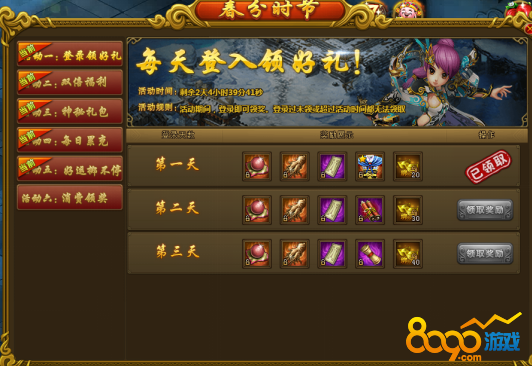 1. 第一天登录即可领取:20绑元、副本卷轴*1、至尊九转丹*1、至尊千年雪参*1、齐鲁好汉限时卡*1;
