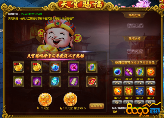 活动规则:活动期间内,玩家消耗一定量元宝来进行赐福,赐福一次消耗20元宝,赐福十次必定获得5福币, 除去赐福获得的奖励道具外,福币可额外兑换稀有道具,福币每天24:00清空,玩家赐福获得的道具会放置在玩家寻宝仓库内,福币兑换的道具则直接进入玩家背包。