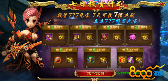 活动规则:活动时间内,玩家可对奖励七天的道具奖励进行投资,投资需要花费一定量元宝,投资成功后,每天登录即可领取丰厚道具奖励和绑元奖励。