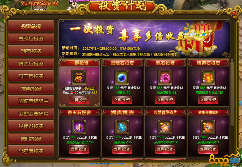 活动规则: 活动时间内,玩家可对奖励七天的道具奖励进行投资,投资需要花费一定量元宝,投资成功后,每天登录即可领取丰厚奖励。玩家开始投资某项道具投资计划之前,可进行一键投资来减少元宝消耗,但是依然可以领取正常数量的投资道具,并且无需二次投资。