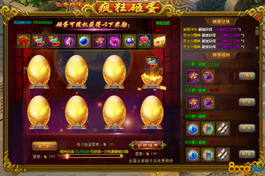 活动规则:活动期间内,玩家消耗20元宝即可进行砸蛋,或直接消耗160元宝,直接砸开8个金蛋,当前金蛋全部被砸开后,自动刷新金蛋,砸开金蛋必定获得道具奖励,砸蛋次数符合要求,即可立即领取砸蛋福利,多砸多送。刷新金蛋有几率出现高级金蛋,高级金蛋砸开后奖励更加丰厚。