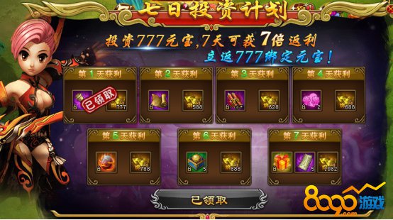 活动规则: 投资777元宝,7天可获得7倍的返利,每天可以领取相应的道具。