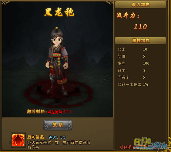 霸气黑龙袍属性:攻击+10,防御+5,生命+100,命中+5,回避率+5,致命一击伤害+1%,最厉害的来了,魔龙罡煞:激活后一定时间提升所有伤害,对于喜欢暴力输出的玩家不容错过。