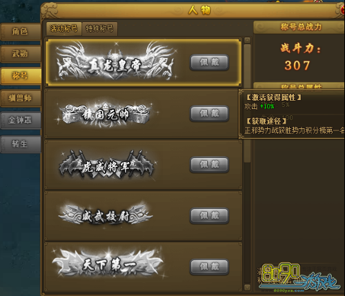 1.真龙皇帝。正邪势力战获胜势力积分榜第一名。称号属性:攻击+10%