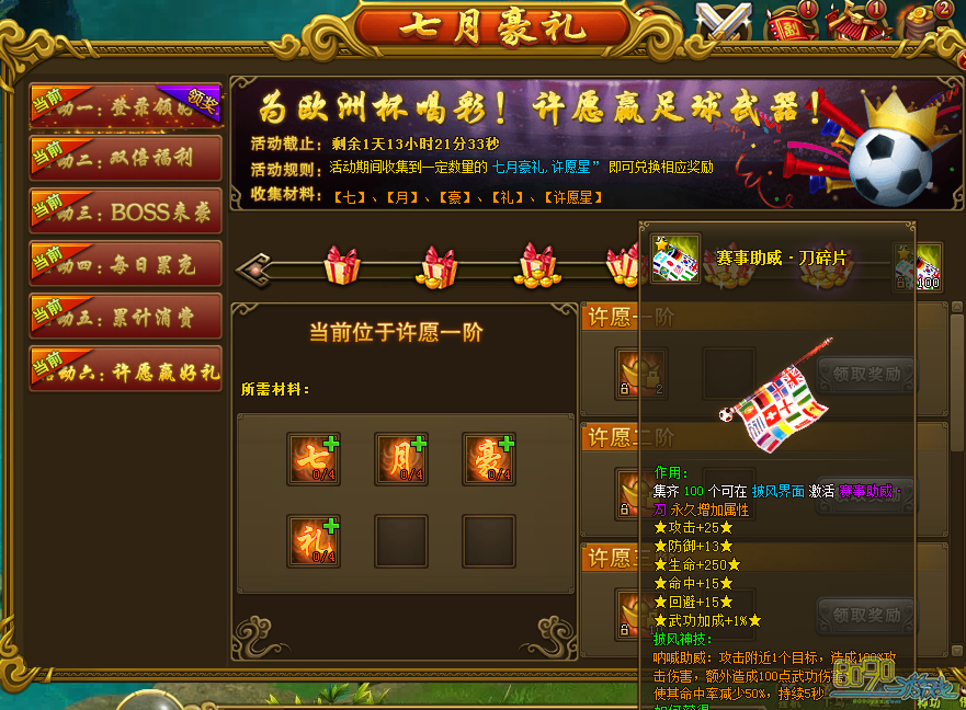 6. 许愿星6层:初级暗器碎片*320、披风兑换卷*170、铸造石礼包*20三选一;
