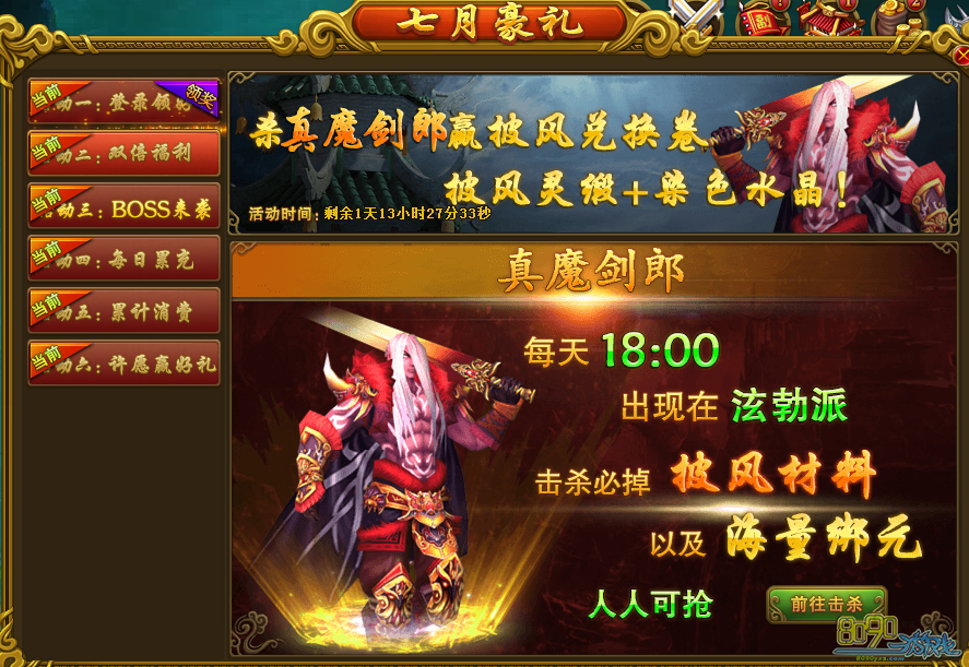 活动规则:活动期间,世界BOSS真魔剑郎每天晚间18:00会出现在1线泫勃派,击杀BOSS即可掉落橙色装备、海量绑元、许愿星、许愿字、披风材料以及染色水晶,人人可抢。