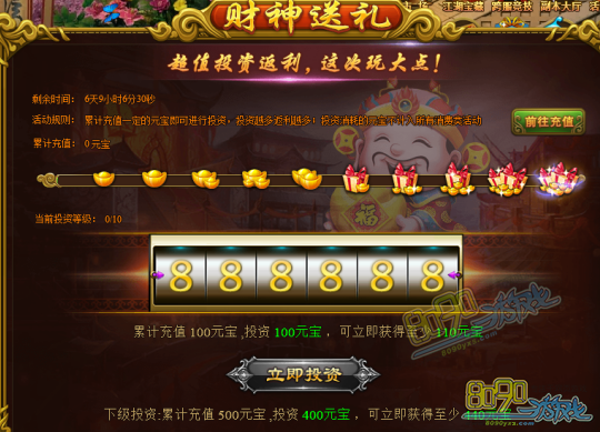 活动规则:活动时间内,玩家累计充值达到一定数量,即可进行投资,投资后立刻返还一定数量元宝,具体返还数量在一定比例内波动,投资分为多个等级,完成当前投资后才能进行下一级投资。