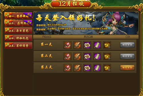1.第一天登录即可领取:至尊九转丹、至尊千年雪参、20绑元、副本卷轴*1、1.5倍经验丹*1;