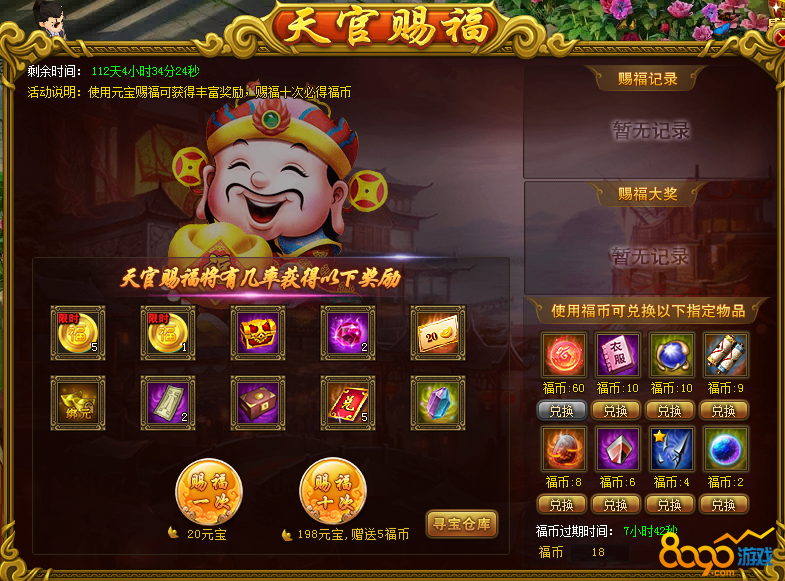 活动规则:活动期间内,玩家消耗一定量元宝来进行赐福,赐福一次消耗20元宝,赐福十次必定获得5福币, 除去赐福获得的奖励道具外,福币可额外兑换稀有道具,福币每天24:00清空,玩家赐福获得的道具会放置在玩家寻宝仓库内,福币兑换的道具则直接进入玩家背包。