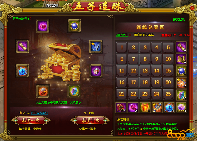 活动规则: 活动时间内,玩家花费20元宝或五子连珠券可单次抽奖,也可直接花费198元宝进行十连抽,每次抽奖必定获得1个物品奖励和数字奖励,集齐一条直线的数字即可获得对应连线奖励,连线奖励和激活数字每天0点重置为初始状态。