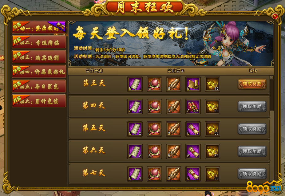 7. 第七天登录即可领取:50绑元、副本卷轴*3、至尊九转丹*1、至尊千年雪参*1、2千驯兽卷轴*1。
