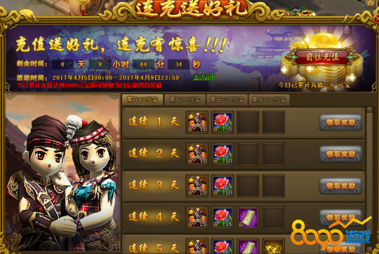 活动规则:活动时间内,累计充值达到指定金额,每天登录游戏即可获得奖励,若某充值档次未达到要求并在接下来的一天内未继续充值,则该充值奖励从第一档第一天重新开始计算,每日零点奖励若未领取则视为放弃领奖,但不影响连续充值进度。