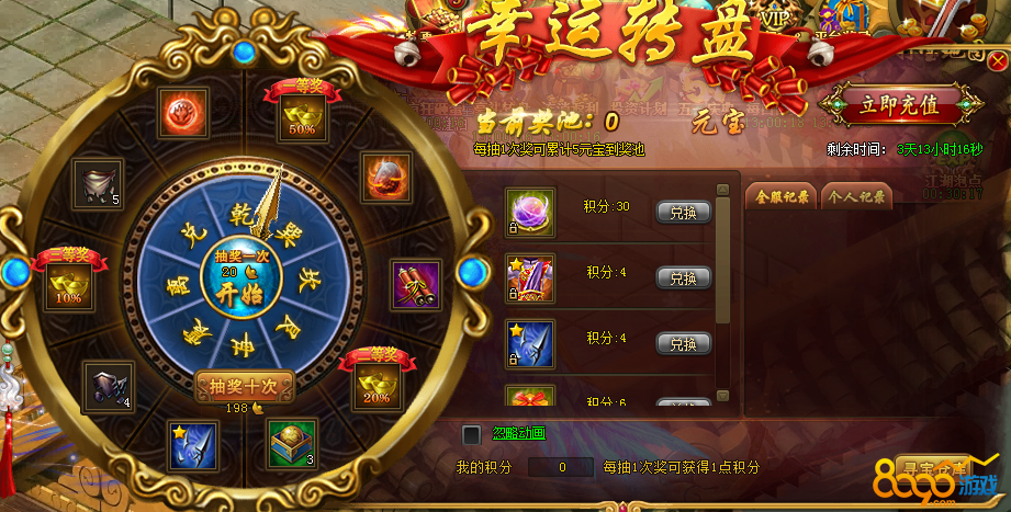 • 热血江湖传跨服幸运转盘活动 抽奖积分兑好礼