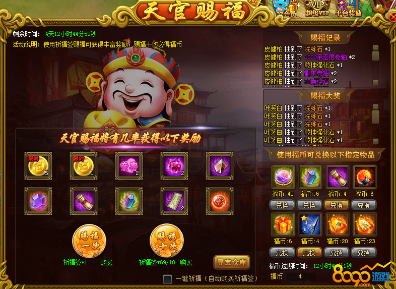 活动规则:活动期间内,玩家消耗祈福签来进行赐福,购买一只祈福签需要消耗20元宝,赐福十次必定获得5福币, 除去赐福获得的奖励道具外,福币可额外兑换稀有道具,福币每天24:00清空,玩家赐福获得的道具会放置在玩家寻宝仓库内,福币兑换的道具则直接进入玩家背包。