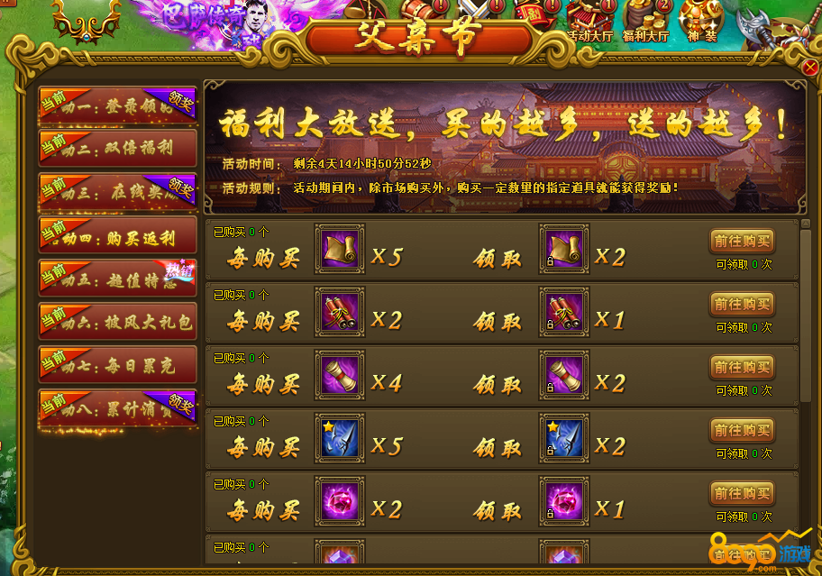 活动规则:活动期间内,达到购买数量可以领取相应的返利道具。