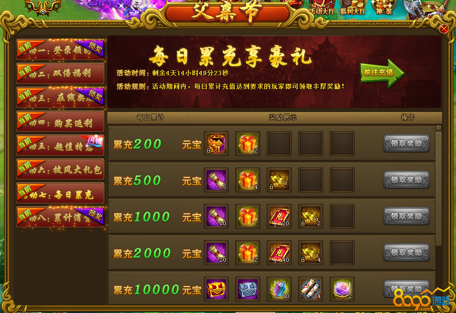 活动规则:活动期间内,每日累计充值金额满足要求即可领取奖励。