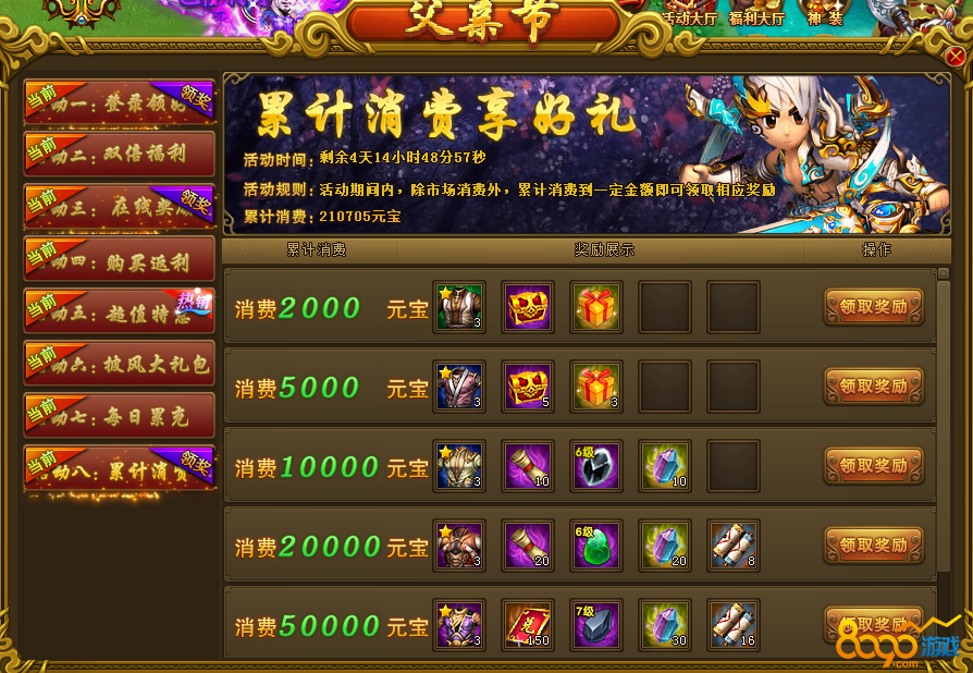 4. 累计消费20000元宝:五阶霓裳战甲碎片*3、2000驯兽卷轴*20、6级武防寒玉石*1、乾坤强化石*20、神佑卷轴*8;