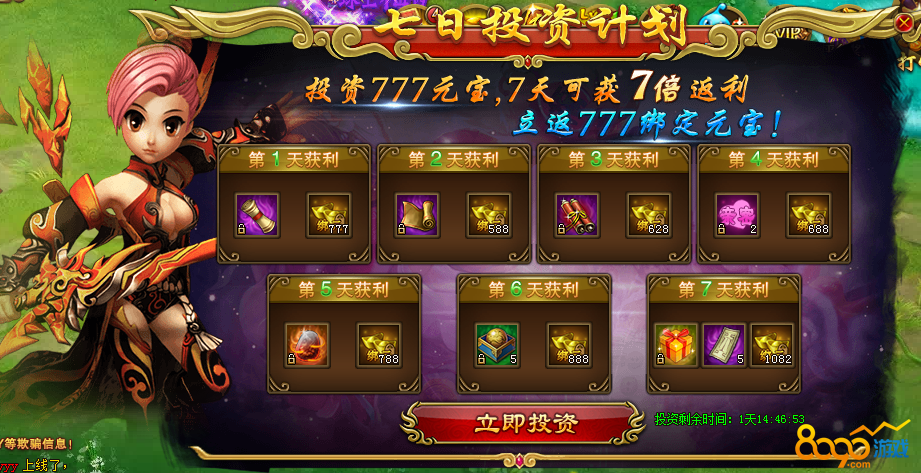 活动规则:活动时间内,玩家可对奖励七天的道具奖励进行投资,投资需要花费一定量元宝,投资成功后,每天登录即可领取丰厚道具奖励和绑元奖励。
