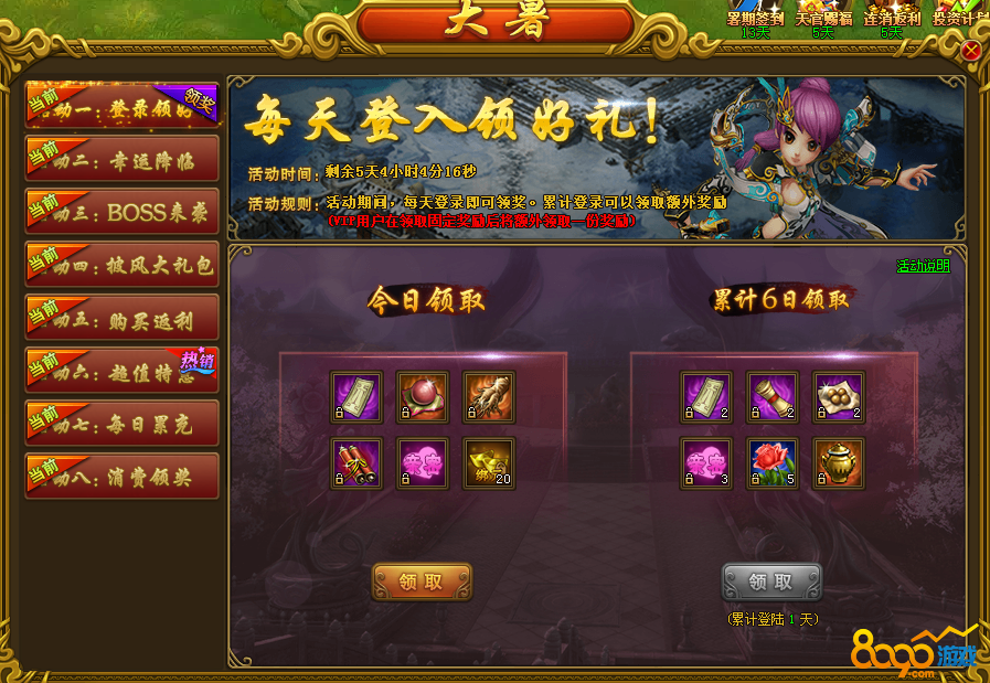 6. 第六天登录即可领取:50绑元、副本卷轴*3、至尊九转丹*1、至尊千年雪参*1、2千驯兽卷轴*1、1千亲密度卷轴*1;